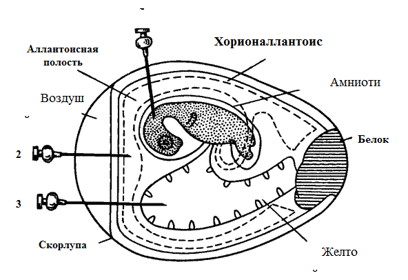 Рис. 56. Строение куриного эмбриона и способы его заражения: 1 – в амнион; 2 – в аллантоисную полость; 3 – в желточный мешок. (Микробиология и иммунология. Под редакцией Воробьева А.А. – М. – 1999). Существует несколько способов заражения развивающегося куриного эмбриона: на хорионаллантоисную оболочку, в аллантоисную и амниотическую полости, желточный мешок, тело эмбриона. Заражение на хорионаллантоисную оболочку применяется для выделения и культивирования вирусов, образующих на оболочках бляшки (вирусы вакцины, натуральной оспы, простого герпеса). Перед заражением яйца просвечивают с помощью овоскопа, карандашом очерчивают границу воздушного пространства и хорионаллантоисной оболочки. Поверхность яйца над воздушным пространством и в месте заражения протирают спиртом, прожигают, обрабатывают йодом и делают отверстие в полости воздушного мешка. На месте заражения скорлупу удаляют так, чтобы не повредить подскорлупную оболочку, которую затем прокалывают короткой стерильной иглой, чтобы не повредить хорионаллантоисную оболочку. Воздух из полости воздушного мешка отсасывают. Вирусный материал (0, 05–0, 2 мл) наносят на хорионаллантоисную оболочку туберкулиновым шприцем с короткой иглой или пастеровской пипеткой. Отверстие в скорлупе закрывают стерильным покровным стеклом или тем же выпиленным кусочком скорлупы и по краям заливают расплавленным парафином. Зараженные эмбрионы располагают на подставке горизонтально и инкубируют в термостате. Вскрытие эмбрионов производится не раньше 48 ч инкубации. На зараженной оболочке обнаруживаются беловатые непрозрачные пятна разной формы (бляшки). Заражение в аллантоисную полость. Вирус, введенный в аллантоис, размножается в эндодермальных клетках, переходя затем в аллантоисную жидкость. Заражение осуществляют следующим способом: в скорлупе над воздушной камерой острием скальпеля или ножниц производят прокол, после чего через отверстие в вертикальном направлении вводят иглу со шприцем, которая проходит через хорионаллантоисную оболочку и попадает в аллантоисную полость, материал вводится в объеме 0, 1 мл и отверстие заливают парафином. Заражение в желточный мешок. С этой целью используют эмбрионы 5–10-дневного возраста. Наиболее употребительны два метода заражения. По первому материал вводится через воздушное пространство. В центре яйца делают отверстие, помещают его на подставку тупым концом вправо и через отверстие в вертикальном направлении вводят иглу, надетую на шприц, игла проходит через хорионаллантоисную оболочку, аллантоисную полость в желток. В желточный мешок можно ввести от 0, 1 до 0, 5 мл вируссодержащего материала. После заражения отверстие в скорлупе заливают парафином, и эмбрион помещают в термостат. По второму методу на границе воздушного пространства с той стороны, где лежит желток (стороны, противоположной от эмбриона), делают прокол скорлупы, через который вводят инфекционный материал. Направление иглы должно быть к центру яйца. Индикацию вирусов в курином эмбрионе осуществляют на основании специфических поражений оболочек и тела эмбриона (оспины, кровоизлияния), а также в РГА. Культивирование вирусов в культуре клеток. Клетки, полученные из различных органов и тканей человека, животных, птиц или других биологических объектов, способны размножаться вн