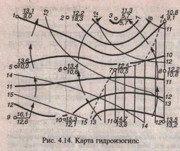 4.45. При выполнении разведочных работ пробурено 12 скважин, расположенных в плане в углах квадратной сетки, как показано на рис. 4.14, на расстоянии 25 м друг от друга (см. ревелис идр., 2001). В табл. 4.3 приведены абсолютные отметки устьев скважин (в числителе) и результаты одновременного замера глубин залегания уровней грунтовых вод (в знаменателе). Используя эти данные, постройте на топографической основе карту гидроизогипс масштаба 1: 500, приняв сечение горизонталей и гидроизогипс через 1 м. На карте покажите направление потока и выделите участки с глубиной залегания уровня грунтовых вод менее 2 м.