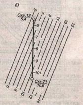 Указание по построению карты гидроизогипс. В заданном масштабе наносят на карту план расположения скважин, обозначая их кружками диаметром 2 мм. Слева от каждой скважины записывают ее номер, справа в числителе —абсолютную отметку устья, в знаменателе — абсолютную отметку уровня грунтовых вод (УГВ). Абсолютную отметку УГВ в каждой скважине вычисляют как разность между отметкой устья и глубиной залегания УГВ. Находят далее путем интерполяции между абсолютными отметками устьев скважин точки с абсолютными отметками, равными целому числу (по заданию сечение горизонталей и гидроизогипс через 1м). Соединив точки с одинаковыми отметками плавными линиями, получают горизонтали рельефа (на рисунке обозначены тонкими линиями). Аналогично путем интерполяции находят точки с абсолютными отметками УГВ. С оединив точки с одинаковыми отметками УГВ плавными линиями, получим гидроизогипсы (на рис. 4.14 —жирные линии). Интерполяцию удобно производить: помощью палетки (рис. 4.15, а), представляющей собой систему параллельных линий (масштабную сетку), проведенных на кальке на равном расстоянии друг от друга (обычно 2...5 мм). Выполняется интерполяция в такой последовательности. Точки, отметки уровней которых подлежат интерполяции, соединяют вспомогательной прямой линией (после окончания работы линия может быть стерта). Палетка накладывается на одну из точек таким образом, чтобы отметка на палетке и отметка точки совпадали. Эта точка фиксируется путем прокола булавкой. Далее палетка поворачивается вокруг булавки до тех пор, пока отметка второй точки не совпадает с отметкой по палетке. На пересечении отрезка, соединяющего точки с масштабной сеткой палетки, находят искомые точки (рис. 4.15, 6). Целесообразно производить интерполяцию, соединяя ближайшие точки отрезками так, чтобы последние образовывали в плане треугольники или четырехугольники (в данной задаче — квадраты). При составлении карты гидроизогипс нельзя интерполировать между точками, расположенными по разные стороны поверхностных водотоков и водоемов. Для выделения участков с глубиной залегания УГВ менее 2 м находят точки пересечения горизонталей и гидроизогипс с разностью отметок 2 м. Линия, проведенная через эти точки, — гидроизобата — будет границей участка. На рис. 4.14 гидроизобата показана пунктирной линией, а участок с глубиной залегания УГВ менее 2 м заштрихован.