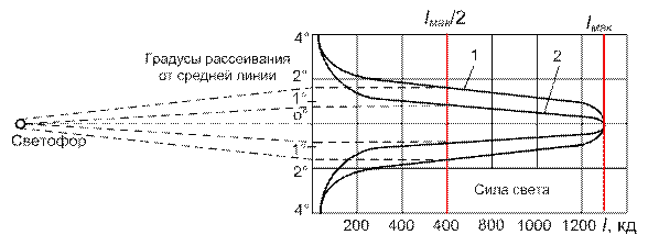 Рис. 43. Состав линзового комплекта Линзы 2 и 4 подбирают и располагают таким образом, чтобы преломленные внутренней цветной линзой лучи по возможности полностью попадали на наружную линзу и выходили из последней слабо расходящимся световым пучком. Сила света светового потока, исходящего из линзового комплекта, в бо́ льшей степени зависит от точности его фокусировки. Например, при смещении нити накала лампы 1 на 1…2 мм от нормального положения сила света снижается на 20…40 % [11]. Сила света также существенно зависит от угла рассеивания. На рис. 44 приведены графики светораспределения в горизонтальной (график 1) и в вертикальной плоскостях (график 2) для линзового комплекта красного цвета мачтового линзового светофора с лампой ЖС12-25. Графики подтверждают, что линзовый комплект обеспечивает достаточно узкую направленность светового пучка. Опытные измерения светового потока, излучаемого линзовым комплектом, показали, что сила света в пределах Как видно из рис. 44, световой поток выходит из линзового комплекта светофора в виде узконаправленного луча и постепенно расходится, при этом вблизи светофора (около 10 м) видимость его из кабины машиниста ухудшается. Для отклонения части сигнального светового потока в направлении машиниста, находящегося в кабине локомотива, в линзовых светофорах применяют отклоняющие вставки 3 с номинальным углом рассеивания 30° (рис. 43, б).