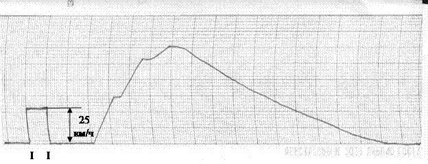 Автомобиль разгоняют с первой или второй передачи (в зависимости от марки автомобиля-лаборатории) до максимально возможной скорости, последовательно включая 2-ю, 3-ю и 4-ю передачи, переводят движение в режим наката (нейтральная передача). Весь процесс записывается на самопишущий прибор (рис. 2), т.е. фиксируют изменение скорости автомобиля по времени