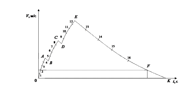 По величине отклонения стрелки находят масштаб записи скорости автомобиля (м/с в одном миллиметре по вертикали). По скорости протяжки ленты определяют масштаб записи времени: 1мм в секунду. Процесс «разгон-накат» с диаграммы переносят на лист миллиметровки формата А4. Цель этого переноса заключается в следующем: 1.Дальнейшие расчеты ведутся графическим методом, а значит, необходимо иметь график как можно большего масштаба. 2.При записи процесса на линию записи накладываются помехи, связанные с вибрацией кузова и с инерционными факторами, не влияющие на рассматриваемый процесс «разгон-накат», поэтому от них освобождаются и, по возможности, идеализируется вид будущего графика. 3.Для дальнейших расчетов применяют метод графического дифференцирования, требующий прямоугольных координат, в то время как на диаграммной ленте процесс записывается в криволинейных координатах. При переносе точек с осциллограммы «разгон-накат» на график (рис. 4) выбирают точки экстремума: - начала движения (0); - выключения 2-й передачи (А); - включения 3-й передачи (В); - выключения 3-й передачи (С); - включения 4-й передачи (D); - выключения 4-й передачи (Е); - остановки (К). На кривых разгона по осциллограмме на каждой передаче выбирают еще по три промежуточных точки, а на кривой выбега еще семь промежуточных точек. Таким образом, на кривой процесса «разгон-накат» выбирают 23 точки и определяют координаты выбранных точек в миллиметрах по осциллограмме (табл. 1).