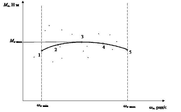Для дальнейших расчетов полученная кривая считается за скоростную характеристику двигателя в процессе разгона автомобиля на всех передачах и принимается за основу при построении силового баланса автомобиля. Выбирают 5 скорректированных значений крутящего момента двигателя на скоростной характеристике (включая точки