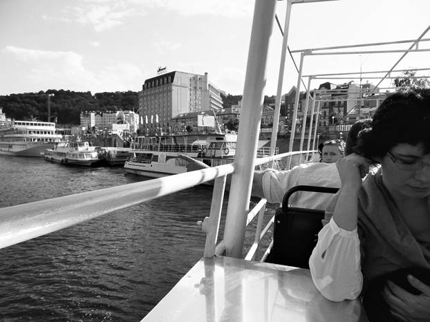 Ярко слепило солнце, как-то стало неуютно, и я предложил спуститься вниз, там почти никого не было, Ты отказалась. Внизу я снова достал фотоаппарат, все вокруг мне было знакомо, я успокоился и расслабился. Справа, на берегу, стадион «Динамо» утопал на склонах яркой зелени деревьев. «Что это там за ограждение? – спросила ты. И я снова вспомнил коллективную фотографию команды «Динамо-Киев». Вслед за Рудаковым на фотографии я не вижу лица, но догадываюсь – это должен быть Владимир Мунтян. Заслуженный Мастер Спорта, 1946 года рождения, родился в городе Котовск Одесской области, уже с 1963 г. в Киевском Динамо, чемпион Советского Союза 66-68 гг., 1971, 1974, 1975. Обладатель кубка 1966 г. и 1974 г., обладатель Кубка Кубков и Суперкубка 1975 г., лучший футболист страны 1969 года…… в Заре Кировоград в За ним в строю Владимир Еремеев. Родился 1948 г. в городе Спасске Приморского края, играть начал 1964 г., в Динамо-Киев с 1967 г., чемпион страны 1971, 1974, 1975 гг. Обладатель Кубка Кубков и Суперкубка 1975 г. Что заставило тебя спуститься и сесть рядом со мной? Я был смущен, рассмотрев тебя поближе: рядом со мной сидела молодая Татьяна Самойлова! – Я догадываюсь, о чем вы меня сейчас спросите, – сказала ты, заметив мой изучающий взгляд. – Да, мне говорят, что я похожа на Самойлову. Татьяна Самойлова, женщина моей мечты, из кинофильма «Летят журавли», сидит передо мной. Мне так захотелось, чтобы эта прогулка не заканчивалась! – Вы не родственники? – спросил я. – Нет, – ответила ты. Корабль начал пришвартовываться, я предложил совместную прогулку. Ты сказала, что собираешься в театр, билетов нет, но хочется успеть. Я посмотрел на часы, было без четверти семь. – Все спектакли начинаются в 7 часов. Не успеете, – сказал я. – Тогда я буду бродить по этим улочкам Подола, – и ты показала в сторону Андреевской улицы, той самой, где я когда-то родился. – Лучшего гида вам не найти, я здесь родился. – Тогда, пошли. И мы пошли… Я предложил интересный маршрут на Андреевский спуск. Мы оказались рядом с моим двором, где все было закрыто на замки. Мы заглядывали в подворотни – везде решетки, никуда не попасть. В пору моего детства я и мои сверстники были более свободны, никаких замков и решеток. Дети, играющие во дворах, музыка из репродукторов на окнах; все было не так. Через решетку подъезда я заметил крыльцо, на котором когда-то сидела грузная Доба, жена маминого брата, и руководила всей жизнью двора. Слева был подъезд, где жил доктор Мазур, справа в полуподвале жила наша дворничиха Мария и ее девочка Маша – молодое существо, которое любило меня, пятилетнего, затаскивать к себе домой. А вот там, прямо в подвале, жил сосед по фамилии Ройзман, который попал в плен вместе с моим отцом и был свидетелем его расстрела. Благодаря ему, я теперь знаю, где захоронен мой отец и каждый год приезжаю к его могиле. Обидно, но этот огромный монумент в Дарницком лесу теперь заброшен и дорога к нему перекрыта шлагбаумом, на котором висит замок. Я увлекся воспоминаниями – ты в это время с интересом рассматривала Андреевскую церковь на вершине горы. – Сейчас мы туда подойдем, – сказал я. А у меня в это время перед глазами все еще было расстелено зеленое поле стадиона. Там начинал играть и вырос в футболиста мирового класса один из лучших украинских игроков. За ним идет Блохин Олег. Родился в 1952 г. в Киеве, в футбол начал играть с 1962 года, с 1970 