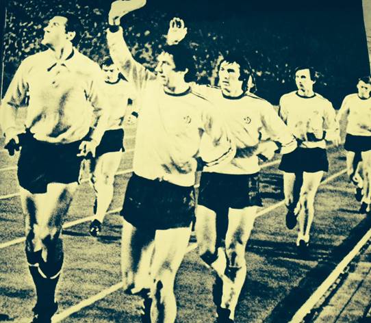 За ним Евгений Рудаков, вратарь команды. Заслуженный мастер спорта, родился в городе Москва 1942 году, в футбол начал играть в группе подготовки столичного Торпедо, в Киевском Динамо с 1973 года. Чемпион СССР 1966-68 гг., 1971, 1974, 1975 гг. Обладатель кубка страны 1964, 1966, 1974 гг., Кубка Кубков и Суперкубка в 75 г, лучший футболист СССР 1971 года. Нестану перечислять всех на фотографии, скажу только, что последний в строю, Виктора Матвиенко, сумел сегодня в трудное для Украинского футбола время, возглавить сборную и вернуться на мировой уровень! Он 1948 г. рождения, играл в Запорожском Металлурге, СКА Одесса.Они все заслуженные мастера спорта, обладатели Суперкубка, о котором идет речь. Большая география талантов! И все родились в пределах этой огромной страны – Союза Советских Социалистических Республик. Мне не хочется упускать мастера спорта международного класса Петра Слободана из села Шипаревцы, Ивано-Франковской области. Мастера спорта Бережного Александра из города Ткварчели в Грузии. Кузнецова Сергея из Крымской области, игравшего в Таврии, и в Симферопольской Заре и, наконец, в Динамо-Киев. Все они тоже добывали Суперкубок и делали футбольную историю своего клуба и всей страны.