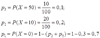 Для значений второй строки данной таблицы сумма всех вероятностей равна 1. Таким образом, само название этой таблицы говорит о том, что единица как бы распределена между всеми значениями случайной величины согласно имеющимся вероятностям. Ряд распределения является табличной формой задания закона распределения. Однако он может быть задан, как и функция в математическом анализе, графическим способом. Если по оси абсцисс отложить возможные значения случайной величины, а по оси ординат – вероятности этих значений, то, соединив точки (х к, р к) последовательно отрезками прямой линии, получим ломаную, которая является графической формой закона распределения дискретной случайной величины и называется многоугольником распределения вероятностей. Иногда многоугольником распределения вероятностей называют, по аналогии с геометрическими фигурами, саму фигуру (многоугольник), расположенную под ломаной линией. Пример 1. В денежной лотерее разыгрывается 10 выигрышей в 50 рублей и 20 выигрышей по 10 рублей при общем числе билетов 100. Найти закон распределения в виде ряда распределения и многоугольника распределения выигрыша Х для владельца одного лотерейного билета. Решение. Возможные значения для случайной величины Х это 0 рублей, 10 рублей и 50 рублей. Вероятности этих значений могут быть найдены по классической формуле, т.е.