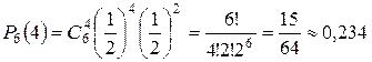 Пример. Симметричную монету бросают шесть раз. Определить вероятность выпадения цифры: а) ровно 4 раза