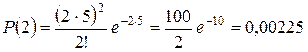 Пример. Среднее число вызовов, поступающих на АТС в одну минуту, равно 2 м. Найти вероятность того, что за пять минут поступит 2 вызова. Решение.