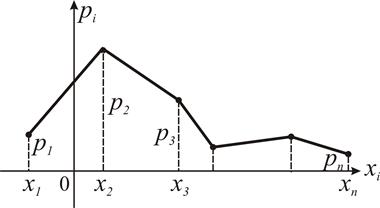 Закон распределения дискретной СВ можно задать графически, если на оси абсцисс отложить возможные значения СВ X, а на оси ординат - вероятности принятия случайной величиной этих значений. Ломаную, соединяющую последовательно точки (x 1, p 1), (x 2, p 2) … называют многоугольником распределения. Схематический вид многоугольника распределения СВ X, принимающей конечное множество значений { x 1, x 2, …, xn } изображен на рисунке 1.