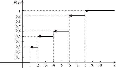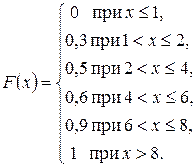 Найти: 1) функцию распределения F (x); 2) M (X), D (X), s(X), моду M 0(X); 3) P (2≤ X < 8). Решение. 1) Найдем функцию распределения F (x) и построим ее график. Для дискретной СВ X по формуле (1.8)