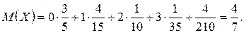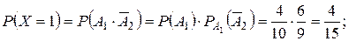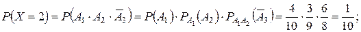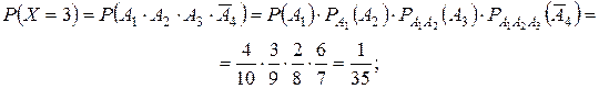 Пример 3. В партии из 10 изделий 6 изделий высшего сорта и 4 первосортных. Наудачу по одному, одно за другим, без возвращения в партию выбираются изделия до тех пор, пока не будет выбрано изделие высшего сорта. Составить ряд распределения случайной величины X – числа отобранных при этом изделий первого сорта. Найти F (X) и M (X). Решение. Множество возможных значений дискретной случайной величины X: {0; 1; 2; 3; 4}. Найдем вероятности, соответствующие этим значениям. Пусть событие Аi – i -ое выбранное изделие первого сорта. Тогда