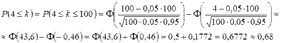 Пример 3. Вероятность выхода из строя изделия за время испытания на надежность p = 0, 05. Какова вероятность того, что за время испытаний 100 изделий выйдут из строя: 1) не менее 4 изделий, 2) ровно 5 изделий. 1) По условию n = 100, p = 0, 05, q = 1 – p = 0, 95. Решение. Воспользуемся интегральной теоремой Муавра-Лапласа