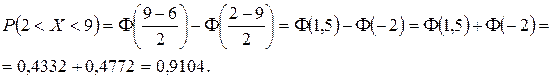Пример 1. Математическое ожидание нормально распределенной непрерывной СВ X M (X) = 6, а среднее квадратическое отклонение s(X) = 2. Найти: 1) вероятность попадания значений СВ X в интервал (2; 9); 2) 3) интервал, симметричный относительно a, в который попадают значения СВ X с вероятностью g = 0, 9642. Решение. 1) Найдем вероятность попадания значений СВ X в интервал (2; 9).
