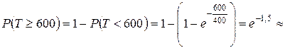 Пример 2. Случайная величина Т (час.) – время безотказной работы прибора имеет показательное распределение. Найти вероятность того, что прибор проработает без ремонта не менее 600 часов, если среднее время безотказной работы приборов этого типа равно 400 часам. Решение. M (T) = 400 час., следовательно, по формуле (1.46)