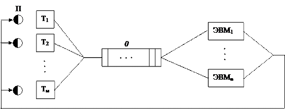 Рассмотрим еще один класс СМО – СМО замкнутого типа. Для замкнутых СМО характерно конечное число заявок, циркулирующих в системе “источник заявок – СМО”. Параметры суммарного входного потока заявок СМО зависят от состояния самой СМО. Примером замкнутой СМО может служить вычислительная система оперативной обработки с диалоговым режимом работы. Система оперативной обработки содержит М терминалов Т 1 -ТМ, за каждым из которых работает пользователь П, формирующий запросы на обслуживание заявки (рис. 6.2). Обслуживание запросов выполняется совокупностью из n однотипных ЭВМ (n ≤ М), рассматриваемых без детализации внутренней структуры как каналы с длительностью обслуживания, распределенной по экспоненциальному закону с математическим ожиданием