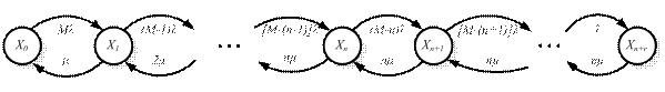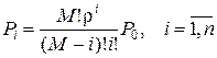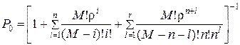 Возможные состояния системы будем связывать с числом пользователей, ожидающих ответа на сделанные запросы, т.е. с числом заявок, находящихся на обслуживании и в очереди: x 0 – в системе нет ни одной заявки, ЭВМ простаивают, все пользователи независимо друг от друга заняты подготовкой запросов; следовательно, интенсивность суммарного потока заявок, переводящего СМО в состояние x 1, равна M λ; x 1 – в системе одна заявка, обслуживанием которой занята одна ЭВМ, пославший запрос пользователь ждет ответа на свой запрос и не формирует новых запросов; следовательно, интенсивность потока перехода в состояние x 2 равна (M- 1)λ; интенсивность потока переходов в состояние x 0 связана с интенсивностью суммарного потока обслуживаний, равной произведению числа занятых ЭВМ на интенсивность потока обслуживаний одной ЭВМ, т.е. 1μ, …; xn – в системе n заявок, все ЭВМ заняты обслуживанием запросов пользователей, очереди на обслуживание еще нет, интенсивность суммарного потока заявок равна (M-n)λ, суммарного потока обслуживаний – n μ; xn+ 1 – в системе n+ 1 заявка, все ЭВМ заняты, одна заявка стоит в очереди на обслуживание, интенсивность суммарного потока заявок равна [ M- (n+ 1)]λ = [ M- (n+r)] λ, где r= 1 – длина очереди, суммарный поток обслуживаний имеет интенсивность n μ; xn+r – в системе n+r=M заявок, т.е. все пользователи сформировали и ввели в систему запросы на обслуживание, n ЭВМ обслуживает n заявок, r=M-n заявок находится в очереди на обслуживание, интенсивность суммарного потока заявок равна нулю, так как все пользователи ждут ответа на свои запросы, интенсивность суммарного потока обслуживания равна n μ. Предельные вероятности состояний: