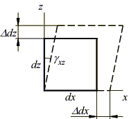 Под действием напряжений этот объем деформируется, в результате каждая грань изменяет свои размеры в направлении координатных осей и может получить угловую деформацию. Так, например, передняя грань принимает вид: