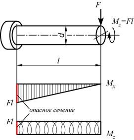 Задача. Определить главные напряжения в опасной точке стержня, подвергающегося совместному действию изгиба и кручения: