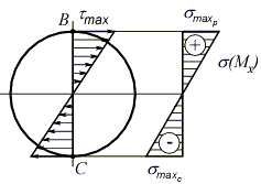 Построив эпюры внутренних силовых факторов, заключаем, что опасным сечением стержня является сечение заделки, в котором действует наибольший по величине изгибающий момент Mx. Для нахождения опасной точки в опасном сечении рассмотрим распределение нормальных и касательных напряжений по опасному сечению: