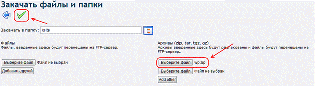 После авторизации мы попадаем в корневую папку нашего сайта. Затем, нажимаем на кнопочку «Закачать». В открывшейся странице выбираем на архив (не тот, что скачали, а wp.zip) и нажимаем на зелененькую галочку (делаете все как на скрине).