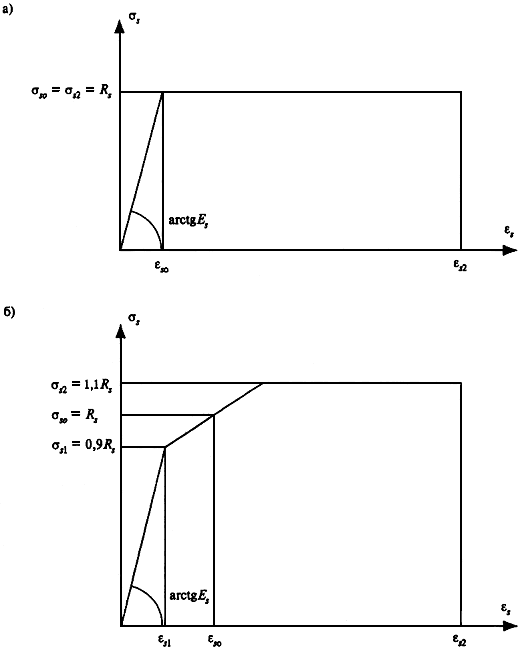 2.2.2.7 При расчете железобетонных элементов по нелинейной деформационной модели в качестве расчетной диаграммы состояния (деформирования) арматуры, устанавливающей связь между напряжениями и относительными деформациями арматуры, принимают для арматуры с физическим пределом текучести классов А240-А500, В500 двухлинейную диаграмму (рисунок 2, а), а для арматуры с условным пределом текучести классов А600-А1000, Вр1200-Вр1500, К1400, К1500 - трехлинейную (рисунок 2, б).