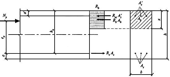 Рисунок 5 - Схема усилий и эпюра напряжений в сечении, нормальном к продольной оси изгибаемого предварительно напряженного элемента при его расчете по прочности в стадии обжатия
