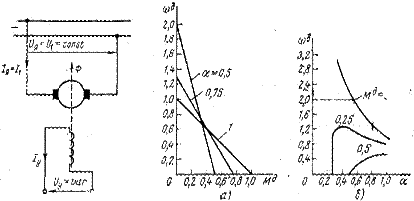 При полюсном управлении исполнительными микродвигателями (рис. 1.2). обмоткой управления служит обмотка главных полюсов, а на обмотку якоря постоянно подается номинальное напряжение U1от независимого источника питания. Управление угловой скоростью якоря осуществляется за счет изменения напряжения управления Uуна зажимах обмотки главных полюсов. При анализе характеристик принимаем: магнитная система двигателя не насыщена, реакция якоря отсутствует. Магнитный поток машины Ф изменяется пропорционально напряжению управления. Для произвольного коэффициента сигнала поток Ф = α Фном, где Фном – значение потока при α =1. Тогда на основании (1.1) – (1.3) получаем уравнение механической характеристики в абсолютных единицах при полюсном управлении: