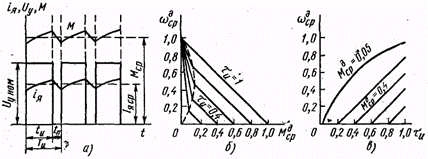Выражение, стоящее в левой части формулы (1.23'), есть среднее за период Тизначение вращающего момента Mср∂ =Мср.и∂ ∙ τ и. Значит, как и следовало ожидать, в установившемся режиме Mср∂ =Мст∂ . Значение Мср.и∂ , соответствующее установившейся средней угловой скорости ω ср∂ , определяем из выражения (1.7) при α =1, так как амплитуда импульсов равна номинальному напряжению управления: