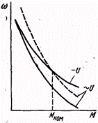 где I и Ф – действующие значения тока и магнитного потока; Т– период тока. Следовательно, вращающий момент, развиваемый универсальным коллекторным микродвигателем при питании от сети переменного тока, определяется не только значением потока возбуждения и тока, как для случая питания от сети постоянного тока, но и сдвигом фаз между ними. Для получения наибольшего момента необходимо, чтобы магнитный поток возбуждения и ток якоря совпали по фазе, т.е. β = 0 и cos β = 1. Поэтому для создания достаточного вращающего момента в двигателе параллельного и независимого возбуждения необходимо применять специальные фазосдвигающие цепочки для выполнения условия β ≈ 0. 2. Характеристики универсального коллекторного микродвигателя при питании от сети переменного тока несколько хуже, чем при питании от сети постоянного тока. Причина расхождения характеристик состоит в том, что при переменном токе на ток и его фазу существенное влияние оказывают индуктивные сопротивления обмоток якоря и возбуждения. Это влияние выражается, в частности, в том, что при работе от сети переменного тока механическая характеристика несколько мягче, особенно при больших нагрузках (сплошные линии на рис. 1.12). Как указывалось, с целью сближения характеристик обмотку возбуждения выполняют секционированной (см. рис. 1.10). При работе от сети переменного тока включается меньше витков обмотки возбуждения (выводы 1 – 2), чем при питании от сети постоянного тока (выводы 3 – 4). Уменьшение числа витков обмотки возбуждения вызывает уменьшение магнитного потока и повышение угловой скорости ротора. Механическая характеристика приподнимается, не меняя своей жесткости (пунктирная линия на рис. 1.12). Соотношение чисел витков, включенных при питании от различных сетей, должно быть таким, чтобы получилось наибольшее сближение характеристик при номинальной нагрузке Мном или нагрузках, близких к номинальным. При одной и той же мощности на валу ток универсального коллекторного микродвигателя с уменьшенным числом витков обмотки возбуждения при работе от сети переменного тока больше, чем при питании от сети постоянного тока, на значение реактивной составляющей тока. Потери мощности также больше, потому что добавляются потери в стали и увеличиваются потери в обмотках от роста потребляемого тока. 3. При работе универсального коллекторного микродвигателя от сети переменного тока существенно ухудшается коммутация и усиливается искрение под щетками. Это объясняется тем, что коммутирующая катушка в данном случае пронизывается пульсирующим магнитным потоком возбуждения и в ней наводится трансформаторная эдс.