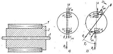 Силы взаимодействия элементарных магнитиков, например M1 и M2, с потоком статора Fэм направлены вдоль этого потока и вращающего момента не создают. При перемещении потока статора в положение Б в том же направлении будут поворачиваться и элементарные магнитики (рис. 2.35, б). Однако вследствие явления гистерезисного запаздывания магнитики M1 и M2 не повернутся на тот же угол, что и поток Ф1 и между ними образуется угол гистерезисного запаздывания γ г. После этого силы взаимодействия Fэм будут иметь тангенциальные составляющие Ft, которые и создадут гистерезисный момент асинхронного режима Mг.а. Возникающий гистерезисный момент пропорционален модулю векторного произведения пространственных векторов магнитного потока ротора Ф2, образованного элементарными магнитиками, и м.д.с. статора F1, которые вращаются с одинаковой угловой скоростью со сдвигом на угол γ г: