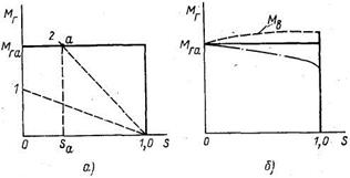 Механическая характеристика реальных гистерезисных микродвигателей не абсолютно жесткая. Изменение гистерезисного момента в функции угловой скорости ротора, (скольжения) объясняется в основном тремя факторами. Во-первых, при неравенстве угловых скоростей ротора и поля в роторе наводятся вихревые токи, которые во взаимодействии с вызвавшим их полем Φ 1 создают момент Mв, являющийся, по существу, моментом асинхронного двигателя (пунктирная линия на рис. 2.36, б). Во-вторых, при конденсаторной схеме включения двухфазного гистерезисного двигателя (см. рис. 2.24, б) в однофазную сеть форма вращающегося магнитного поля статора, а значит, и момент Мг.а (штрихпунктирная линия на рис. 2.36, б) зависят от угловой скорости ротора. При изменении угловой скорости ротора меняются частота перемагничивания, потери в роторе и соответственно ток в обмотках статора. Происходит перераспределение напряжений между конденсатором и обмоткой; при этом поле, круговое при одном скольжении (например, при s = 0), становится эллиптическим при другом.