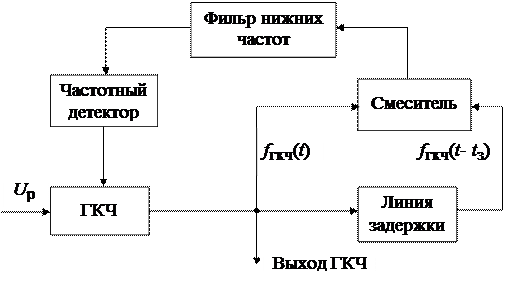 Первый способ. Напряжение с выхода ГКЧ (рис. 3.3) подают на один вход смесителя. На второй вход смесителя подают то же напряжение, прошедшее через линию задержки со временем задержки tз, т.е. fгкч(t- tз). Напряжение с выхода смесителя подается на фильтр нижних частот (ФНЧ), выделяющий разностную частоту