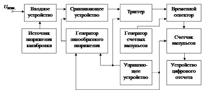 Измеряемое напряжение через входное устройство подается на один из входов компаратора. На другой вход поступают эталонные напряжения Uэт. Пусть в нашем случае дискретные значения эталонных напряжений соответствуют разрядам двоичной системы счисления. Подключение эталонных напряжений к компаратору производится тактовыми импульсами управляющего устройства, причем подключения начинаются со старшего разряда. В компараторе измеряемое напряжение сравнивается с эталонным или суммой эталонных напряжений. Если Uэт < Uизм, то управляющее устройство выдает тактовый импульс, дающий команду на подключение к предыдущему значению эталонного напряжения следующего напряжения низшего разряда. Если и после этого Uэт < Uизм, то на компаратор поступает очередное значение Uэт. Когда после следующего тактового импульса суммарное значение эталонных напряжений на входе компаратора становится больше Uизм, управляющее устройство под действием выходного сигнала компаратора отключает эталонное напряжение, соответствующее этому тактовому импульсу, то есть данный разряд пропускается. Следующий тактовый импульс подключает к сумме напряжений на входе компаратора напряжение, идущее за пропущенным разрядом. Процесс заканчивается при достижении равенства измеряемого напряжение с суммарным значением эталонных напряжений. В данном примере это суммарное напряжение соответствует Uизм в двоичном коде. Далее используется дешифратор, преобразующий двоичный код в десятичный. Точность такого вольтметра определяется количеством разрядов цифрового кода (числом дискретных значений эталонных напряжений), стабильностью Uэт и пороговой чувствительностью компаратора.