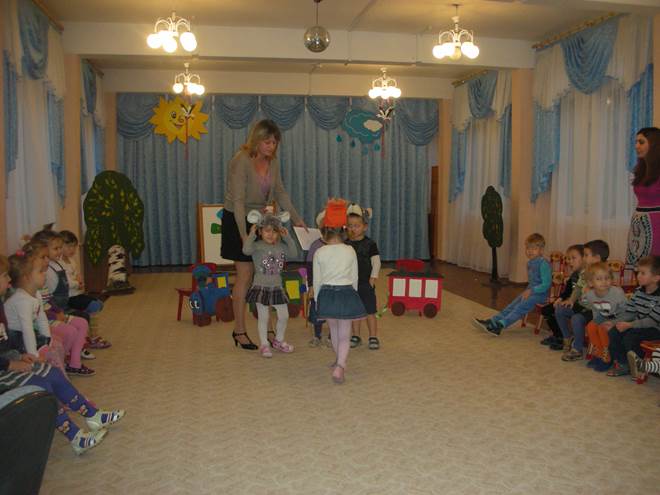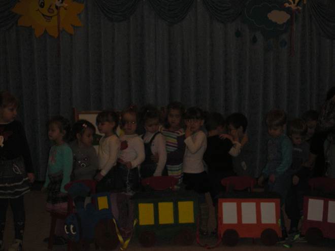 Звучит песня «Голубой вагон». (дети имитируют движения поезда)