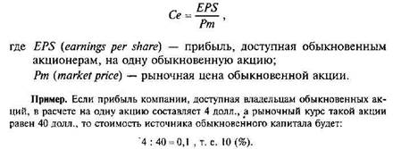 Пример. Из предыдущего примера видно, что номинальный уровень отдачи на вложенный обыкновенными акционерами капитал составляет 10 %, однако если вероятность получения этой прибыли снижается, это означает увеличение риска для инвесторов, поэтому они вправе требовать более высокую норму доходности на свои инвестиции. Если уровень премии за риск, установленный на договорной основе, равен 2 %, то стоимость источника обыкновенного капитала составит: