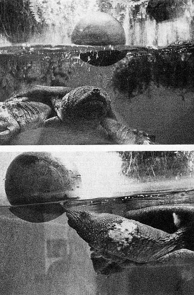 Для Хрюшки жизнь в зоопарке недавно улучшилась – теперь ему давали палки и другие предметы, с которыми он проделывал разные трюки. Например, он толкал носом баскетбольный мяч и иногда пытался укусить его. Его любимыми предметами были кольца из резинового шланга, которые он поддевал носом, жевал и иногда проплывал сквозь них. Днем, когда его бассейн чистили, он становился под струю воды и стоял неподвижно, а когда бассейн наполнялся, снова уплывал. У читателей может сложиться впечатление, что Хрюшка – это выдра или морской котик. Фильмы с его участием действительно напоминают игры морских котиков, хотя в сильно замедленном движении. Его поведение похоже на поведение млекопитающих, лишь когда пленка проигрывается с трехкратным ускорением, потому что Хрюшка – это черепаха (см. фото). Между нашими играми и играми других животных существует большое сходство. Когда мы смотрим, как играют наши дети, это кажется забавным, но при этом они учатся прилагать свои способности к будущим жизненным потребностям. Игры с предметами, такие как толкание игрушечного грузовика или мячика, напоминают более поздние действия, вроде забивания гвоздя, охоты или сборки механизмов. Игра может и явно напоминать действия животных. Малышам нравится жевать и разрывать разные вещи. Укусы – распространенное явление в центрах дошкольного воспитания; они также служат напоминанием о нашем происхождении. Игра широко распространена среди животных, причем не только среди птиц и млекопитающих, она свойственна всем позвоночным и даже беспозвоночным. Как мы можем догадаться, что животное играет? У исследователей есть три критерия. Во-первых, игра хотя и напоминает серьезное поведение, такое как охота или бегство, но движения молодого животного преувеличенные, неловкие или изменены каким-то другим образом. Во-вторых, игровые действия не служат непосредственной цели выживания. Животные просто играют ради самой игры, поскольку она доставляет удовольствие. В-третьих, игра обычно начинается, когда животное не подвергается никакому стрессу и не имеет никаких более насущных дел. Этим критериям игры соответствует поведение прыгающей рыбы-иглы, резвящихся в воде аллигаторов и ящериц. В Вашингтонском национальном зоопарке можно видеть варанов, играющих в прятки. Самый большой вид варановых, «дракон» с острова Комодо, играет в перетягивание каната с зоологами, наблюдающими за его поведением. Он может вытащить из кармана знакомого человека записные книжки и другие предметы и ходить вокруг, нося их в пасти. Игра с вараном острова Комодо немного похожа на игру с собакой, но происходит вдвое медленнее. Когда варан играет в перетягивание каната с человеком, который держит пластиковое кольцо, это поведение не является имитацией охоты или собирательства. Если кольцо покрывают пахучим льняным маслом или кровью животного, то игривость сразу исчезает и сменяется желанием забрать предмет себе. Видеоролики на You Tube с изображением варанов, заглатывающих целых свиней или даже других варанов, показывают, что поведение, связанное с охотой, трудно перепутать с игрой.