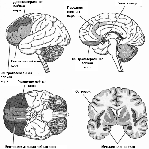 Все мы испытывали чрезвычайно сильные и неконтролируемые эмоции. Представьте себе, что вы все время чувствуете подобное, и вы получите картину повседневного восприятия маленького ребенка. Одна из причин, почему жизнь с малышами так беспокойна, состоит в том, что структуры нервной системы, которые ведают самими эмоциями, развиваются раньше, чем те, что интерпретируют эмоции и управляют ими. Эмоции организуют нашу психику. Будучи основными сигналами выживания, эмоции присутствуют с самого рождения, хотя с возрастом они становятся все более сложными. На самом фундаментальном уровне эмоции (в отличие от настроений и долговременных чувств) представляют собой реакции на окружающую среду, позволяющие нам быстро отличить приятные аспекты от угрожающих. Эмоции также вынуждают нас уделять внимание ярким событиям, определять жизненные ценности, готовят наше тело к действию и сообщают другим людям о нашем внутреннем состоянии. Определенные эмоции универсальны и проявляются во всех изученных культурах. Эксперименты показали, что восприятие многих выражений лица, обозначающих так называемые базовые эмоции (страх, радость, отвращение, удивление, печаль и интерес), фактически встроено в человеческую биологиюУпомянутый эксперимент касался только перечисленных базовых выражений лица, в некоторых других деталях мимики существуют культурные различия и трудности межкультурного понимания. – Прим. ред.. Поэтому мы можем понять, когда кто-то рад видеть нас или сердится, даже если у нас с этим человеком нет общей истории, языка и он принадлежит к другой культуре. Новорожденные дети могут улыбаться, но они начинают улыбаться в ответ на внешние события, такие как появление лица, голоса или укачивание, лишь в возрасте от 3 до 8 недель. Примерно к 3-м месяцам они больше улыбаются при виде знакомых лиц, а также выказывают интерес и удивление. К 4-м месяцам младенцы умеют смеяться, а их тяга к визуальным играм, таким как «ку-ку» или наблюдение за смешными лицами, усиливается в течение первого года жизни. Признаки негативных эмоций тоже появляются в начале жизни. Раньше всего можно наблюдать удивление, отвращение и недовольство, которые (как и улыбка) могут быть не связаны с внешними событиями в первые 2–3 месяца жизни. Выражения гнева и печали появляются на лице младенца в 3-месячном возрасте и обычно бывают спровоцированы болью или разочарованием. Все эти проявления эмоций помогают обеспечить заботу родителей и других взрослых. Возможно, вы помните, как ваш малыш впервые улыбнулся вам. Его способность распознавать эмоции на лицах других людей развивается почти одновременно со способностью проявлять собственные чувства. К 2-м или 3-м месяцам регион затылочно-височной коры, который специализируется на распознавании увиденного, уже активируется лицами чаще, чем другими предметами, хотя его настройка на этом этапе значительно более широкая, чем в зрелом возрасте. К 7-м месяцам младенцы дольше смотрят на испуганное лицо, чем на счастливое или нейтральное, и их лобная кора проявляет биоэлектрическую реакцию, которую связывают со зрительным стимулом. Миндалевидное тело находится в центре системы мозга, отвечающей за обработку эмоций (см. рис.). Оно получает входные данные от разных зон мозга, в том числе информацию от всех органов чувств. Выходные сигнал