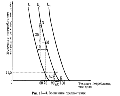 Отказ от следующих 10 тыс. долл. дается, как правило, труднее и должен быть компенсирован большим вознаграждением. Поэтому кривые безразличия будут приближаться к вертикальному положению. Больший угол наклона характерен для кривых безразличия тех индивидов, кто стремится к немедленному вознаграждению. Предельная норма временного предпочтения MRTP (marginal rate of time preference) — это стоимость дополнительного будущего потребления, достаточного для компенсации отказа от единицы текущего потребления при условии, что общее благосостояние индивида не изменится.