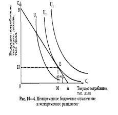 Люди, осуществляющие сбережения, сравнивают текущее потребление с будущим. На рис. 10—3 изображены кривые безразличия для настоящего и будущего потребления. Обычный потребитель имеет положительные временные предпочтения (time preference). Это означает, что отказ от расходования одного доллара в настоящем должен принести ему более 1 долл. в будущем. Предположим, что доход индивида составляет 100 тыс. долл. в год. Если он потребляет в текущем году все 100 тыс., то его сбережения равны 0. На графике (рис. 10—3) эта ситуация отражена точкой К. Допустим, наш индивид решил откладывать деньги на " черный день". Предположим, что величина этих сбережений ради будущего потребления равна 10 тыс. долл. текущего дохода. Такое ответственное решение может быть принято рациональным индивидом только в том случае, если в будущем эти 10 тыс. долл. позволяют ему потреблять на сумму, превышающую 10 тыс., например 11, 5 тыс. долл. Эту ситуацию отражает на графике точка L.