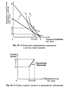 Межвременные предпочтения касаются инвестиций как в физический, так и в человеческий капитал. В обоих случаях люди сокращают текущее потребление в надежде увеличить его в будущем. Возможности ограничения текущего потребления в пользу будущего не безграничны. Сбережения определяются общей суммой дохода за вычетом текущего потребления: S= I-Ci где S — сбережения; I — доход; Сi — текущее потребление. Межвременное бюджетное ограничение показывает возможности переключения текущего потребления на будущее потребление. Наклон межвременного бюджетного ограничения АВ (см. рис. 10—4) равен- (1 + i) Угол наклона зависит от ставки ссудного процента. Чем он выше, тем круче наклон межвременного бюджетного ограничения. Точка касания кривой временного предпочтения с межвременным бюджетнымограничением характеризует межвременное равновесие. В точке равновесия наклон временного предпочтения равен наклону межвременного бюджетного ограничения. MRTP = -(1+ i) (10.4) Точка Е на рис. 10—4 характеризует межвременное равновесие. Близость ее к точке А или к точке В зависит от дохода, склонности к сбережению и величины процента. Рост ставки ссудного процента выражается в повороте межвременного бюджетного ограничения по часовой стрелке (рис 10—5). Увеличение ставки процента с 15 до 20 вызвало рост сбережений с 20 до 30 тыс. долл. (рис. 10—6). При этом будущее потребление текущего дохода выросло с 23 тыс. долл. (20 х 1, 15) до 36 тыс. долл. (30 X 1, 20). Это означает, что благодаря повышению ставки процента стало дешевле получить доллар будущего потребления за счет текущих долларов. Естественно, это побуждает к накоплению.