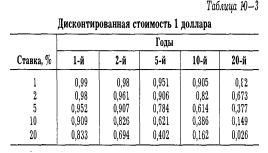 Определим теперь сегодняшнюю цену того доллара, который мы получим в будущем. Если мы сбережем 1 долл. сейчас, то через год при ставке процента i мы получим. 1 долл х (1 + i). Тогда 1 долл., полученный через год, сейчас стоит меньше 1 долл., а именно: 1 долл./ (1 + i). Очевидно, что доллар, который мы получим через 2 года, сегодня стоит: 1 долл./ (1 + i)2 и т. д. Поэтому текущая дисконтированная приведенная стоимость (Present Discount Value — PDV) — это нынешняя стоимость 1 доллара, выплаченного через определенный период времени. Если этот период равен одному году, PDV = 1/(1+i) Для n лет PDV = 1/(1+i)n (10.5) Текущая дисконтированная стоимость зависит от ставки процента. Чем выше ставка процента, тем ниже текущая дисконтированная стоимость (табл. 10—3). Доллар, который мы получим через 10 лет при 5-процентной ставке, сегодня стоит 61, 4 цента, при 10- процентной ставке — 38, 6 цента, а при 20-процентной ставке — всего 16, 2 цента.