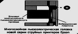 Принцип работы струйных принтеров напоминает игольчатые принтеры, но вместо иголок здесь применяют тонкие сопла, которые находятся в головке принтера. В головке установлен резервуар с жидкими чернилами, которые через сопла как микрочастицы переносятся на материал носителя. Число сопел составляет 16..64, а иногда нескольких сотен. Для хранения чернил используют 2 метода: 1) головка принтера объединена с резервуаром для чернил. Замена резервуара с чернилами требует замену головки; 2) используется отдельный резервуар, который через систему капилляров обеспечивает чернилами головки принтера. В основе принципа действия струйных принтеров лежат: