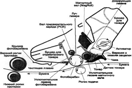 Рис. 3. Картридж в разрезе Основные конструктивные элементы отделения для отработанного тонера: - фоточувствительный барабан (Organic Photo Conductor (OPC) Drum). Аллюминиевый цилиндр с покрытием из органического светочувствительного и фотопроводящего материала (обычно оксид цинка); - вал первичного заряда (Primary Charge Roller (PCR). Металлический вал с нанесенной токопроводящей резиновой или поролоновой основы. Обеспечивает равномерный отрицательный или положительный заряд барабана. Некоторые модели принтеров используют для этого специальную сетку из тонкой проволоки. Барабан заряжается от коронного разряда, поэтому сетку называют «коронной»; - чистящее лезвие, «Вайпер», ракель. (Wiper Blade, Cleaning Blade). Металлический каркас с полиуретановой пластиной (blade) на конце. Очищает барабан от остатков тонера, который не был перенесен на бумагу. Основные конструктивные элементы тонерного отсека: - магнитный вал (Magnetic Developer Roller, Mag Roller, Developer Roller). Металлическая трубка, внутри которой находится неподвижный магнитный сердечник; - «Доктор» (Doctor Blade, Metering Blade). Металлический каркас с гибкой пластиной (blade) на конце. Обеспечивает равномерное распределение тонкого слоя тонера на магнитном вале; - бункер для тонера (Toner Reservoir). Содержит «рабочий» тонер (частицы специального пластика и оксида железа, которые плавятся при нагреве), который будет перенесен на бумагу в процессе печати. В бункер также встроен активатор тонера (Toner Agitator Bar) - проволочная рамка для перемешивания тонера; - специальный шаговый двигатель. Поворачивает фотобарабан для формирования строки изображения. Это смещение соответствует разрешающей способности принтера по вертикали и обычно составляет 1/600 или 1/1200 дюйма. 2. Принцип лазерной печати Печать на лазерном принтере - многоступенчатый процесс, который включает такие этапы: 1. подготовка к печати. Когда включается принтер, все компоненты картриджа приходят в движении и происходит подготовка картриджа к печати. Этот процесс заключается в очистке барабана, который состоит из 2 этапов. Сначала барабан очищают механически при помощи ракеля, который аккуратно проходит по барабану и снимает с него остатки тонера. Затем барабан очищается электростатически при помощи стирающей лампы, которая облучает барабан и засвечивает его, стирая ранее нанесенные изображения (рис. 4);