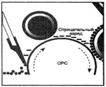 Рис. 7. Проявление изображения Это устройство называется проявляющим цилиндром. Во время вращения проявляющего цилиндра часть его поверхности находится в контакте с порошком тонера, который находится в резервуаре. Благодаря собственным магнитным свойствам, к нему притягиваются нейтрально заряженные частицы тонера. Когда проявляющий цилиндр поворачивается в направлении фоточувствительного барабана с изображением, уже нарисованным на нем лазером, специальные пластины снимают излишек тонера с поверхности цилиндра. Создавая на его поверхности тонкий равномерный слой тонера и подготавливая его к созданию видимого изображения. Электрические свойства проявляющего цилиндра изменяются под действием смещающего потенциала, который создан постоянным напряжением и переменным электрическим потенциалом. Величина потенциала, создающего постоянное смещение, изменяется пользователем, задающим насыщенность печатаемого изображения. Теперь проявляющий цилиндр предоставляет отрицательно заряженный тонер в расположение областей, засвеченных лазерным лучом, которые притягивают частицы тонера, становясь при этом более положительно заряженными, чем сам тонер. Переменное поле воздействует на постоянное смещение, создаваемое тонером, чтобы избежать появления отрицательного заряда на цилиндре и создать равномерное распределение тонера в пространстве. Это воздействие происходит с частотой 60 Гц и позволяет создать небольшой туман из частиц тонера, который воздействует на области, подвергшиеся лазерному излучению. Частицы тонера переносятся на фоточувствительный барабан в определенные места, которые имеют электрический заряд, и уже не могут вернуться на проявляющий цилиндр; 7. перенос изображения. Изображение уже существует на барабане в виде распределения частиц тонера. В лазерном принтере тонер переносят на бумагу за счет придания бумаге большого положительного потенциала (+600В). Этот потенциал создается с помощью вторичной короны (короны переноса), благодаря которой тонер «перепрыгивает» с барабана на бумагу (рис. 8).