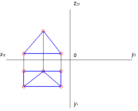2. Накреслити задані проекції багатогранника, відновлюючи проекційний зв'язок між проекціями вершин. Зображення проекцій багатогранника збільшити.