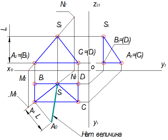 5. Побудувати сліди (на рисунку тт. M і N) та визначити графічно натуральну величину відрізка (на рисунку це ребро AS).
