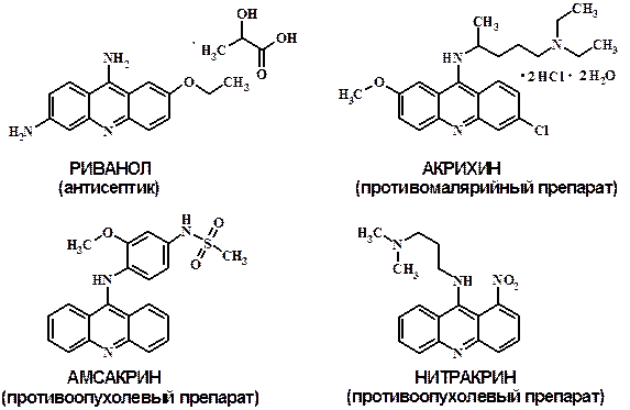 Многие аминоакридины обладают значительным противомикробным и противовирусной активностью. В ряде случаев показано ингибирующее действие аминоакридинов на размножение микобактерий [65]. Известны работы по созданию противовирусных средств для лечения хронических вирусных инфекций. Бис-акридины при слабом мутагенном эффекте являются сильными ингибиторами роста Salmonella typhimurium [66]. В настоящее время активно ведутся исследования в направлении синтеза и дизайна новых противовирусных и противоопухолевых препаратов акридинового ряда [67] и по изучению механизма взаимодействия соединений этой группы с ДНК-РНК [68, 69].