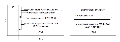 Пояснительная записка, технологическая документация (для специальности 2- 36 01 01), чертежи, сложенные до формата А4 (укладка и брошюрование форматов показаны в приложении Г) и спецификации укладываются в папку с тесемками. На лицевую сторону наклеивается этикетка размерами 110х75, изготовленная из чертежной бумаги. Для курсового проекта на этикетке указывается название предмета, шифр группы, фамилия и инициалы учащегося и год выполнения проекта. Пример оформления этикетки и расположение ее относительно кромок папки – рисунок 1. Для дипломного проекта на этикетке указывается шифр специальности, шифр группы, фамилия учащегося и год выполнения проекта.