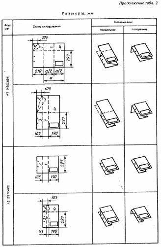 Укладку и брошюрование форматов определяет ГОСТ 2.501-88 (СТ СЭВ 159-83): 1. Листы чертежей всех форматов следует складывать сначала вдоль линий перпендикулярных (продольных), а затем вдоль линий параллельных (поперечных) к основной надписи; 2. Листы чертежей после складывания должны иметь основную надпись на лицевой стороне сложенного листа; 3. Листы чертежей складывают в последовательности, указанной в табл. 1 и 2, цифрами на линиях сгибов; 4. Устанавливаются следующие виды складывания: - в папки в соответствии с табл. 1; - для непосредственного брошюрования в соответствии с табл. 2.