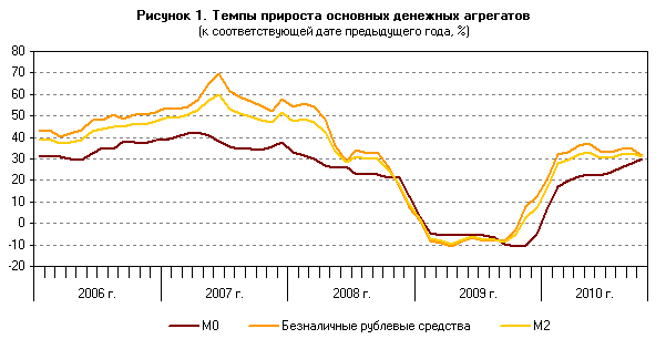 Рисунок 2. Темпы прироста денежного агрегата М2 (месяц к предыдущему месяцу, %) Денежный агрегат М0 за 9 месяцев 2010 г. возрос на 12, 0% (за аналогичный период 2009 г. он сократился на 8, 1%). При этом в январе—марте отмечалось сезонное снижение наличных денег в обращении (на 1, 3% за квартал), в апреле—июне они росли сравнительно высокими, а в августе—сентябре — умеренными темпами (9, 6 и 3, 6% за соответствующие кварталы). В годовом выражении темп прироста денежного агрегата М0 на 1.10.2010 составил 29, 8%, в то время как на 1.10.2009 он был отрицательным (–10, 7%). Определенное влияние на динамику наличных денег оказывал спрос населения на иностранную валюту. По итогам 9 месяцев 2010 г. объемы продажи наличной иностранной валюты уполномоченными банками физическим лицам превысили объемы ее покупки немногим более чем на 1 млрд. долл. США (в аналогичный период 2009 г. нетто-продажи составили почти 15 млрд. долл. США). При этом в первом полугодии наблюдались нетто-покупки в объеме 2, 4 млрд. долл. США, тогда как в III квартале нетто-продажи составили почти 3, 5 млрд. долл. США. Безналичная составляющая денежного агрегата М2 за 9 месяцев 2010 г. увеличилась на 14, 8% (за аналогичный период 2009 г. — на 4, 8%). При этом за I квартал безналичные рублевые средства выросли на 3, 0%, за II квартал — на 6, 8%, за III квартал — на 4, 4%. Их скользящие годовые темпы прироста на 1.10.2010 составили 31, 7%, тогда как на 1.10.2009 они были отрицательными (–2, 9%). Если средства юридических лиц на рублевых счетах за январь—сентябрь 2010 г. увеличились незначительно — на 3, 1%, то средства физических лиц выросли на 27, 4% (за 9 месяцев 2009 г. — рост на 1, 1% и 9, 3% соответственно). В рассматриваемый период депозиты " до востребования" организаций возросли на 15, 5% при снижении их срочных депозитов на 10, 8%. В то же время у населения опережающими темпами росли срочные депозиты (30, 8%) по сравнению с депозитами " до востребования" (14, 0%). При этом увеличение депозитов населения было обусловлено как ростом доходов домашних хозяйств, так и ростом их склонности к сбережению. Общий объем рублевых депозитов " до востребования" за январь—сентябрь 2010 г. увеличился на 15, 1% (за аналогичный период 2009 г. он уменьшился на 0, 3%), а их скользящие годовые темпы прироста на 1.10.2010 составили 28, 7% (на 1.10.2009 они были отрицательными и составили –7, 6%). Общий объем срочных рублевых депозитов за рассматриваемый период увеличился на 14, 6% (за 9 месяцев 2009 г. — на 8, 2%), их годовые скользящие темпы прироста на 1.10.2010 составили 33, 6% по сравнению с 0, 2% на 1.10.2009. В структуре рублевой денежной массы доля наличных денег в обращении на 1.10.2010 уменьшилась относительно 1.01.2010 на 0, 4 процентного пункта (до 25, 3%), удельные веса депозитов " до востребования" и срочных депозитов увеличились на 0, 2 процентного пункта (до 27, 9 и 46, 8% соответственно). Скорость обращения денег, рассчитанная по денежному агрегату М2 в среднегодовом выражении, за январь—сентябрь 2010 г. снизилась на 7, 7% (за 9 месяцев 2009 г. — на 1, 6%). Уровень монетизации экономики (по денежному агрегату М2) за рассматриваемый период возрос с 33, 8 до 36, 6%.